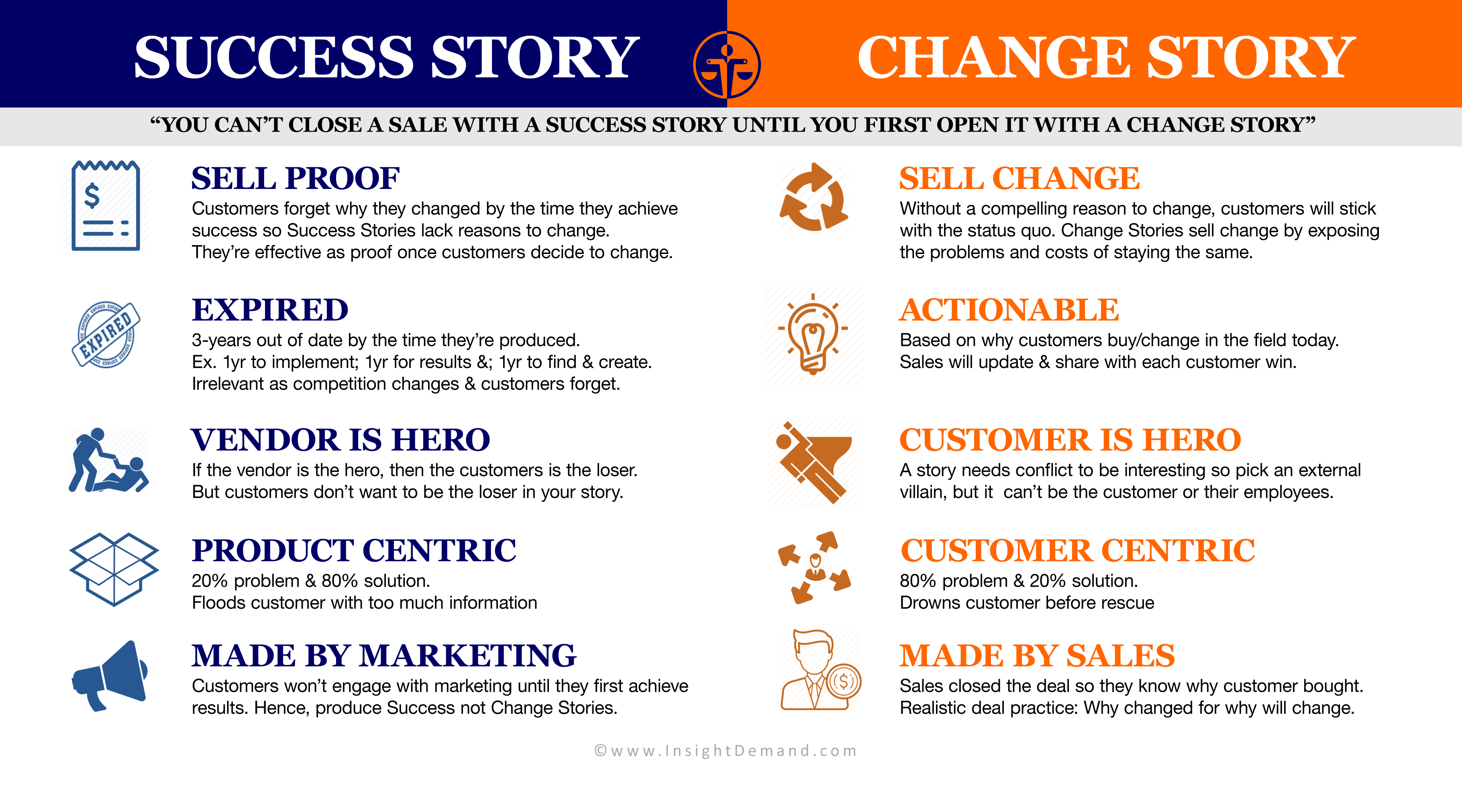 Salespeople will fail at selling change with marketing’s success stories, because by the time customers achieve success, they will have either forgotten why they changed or the competitive landscape will have changed so much that the reasons are no longer relevant.