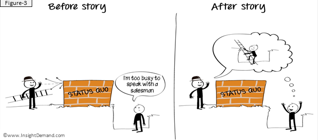 So instead of trying to force insights through the buyer’s defensive wall, sellers should deliver their message via a story, because they’re about someone else so they are nonthreatening (see figure-3). Without feeling attacked, customers can now relax and take in the seller’s story. And if the story is insightful enough, they may start to tell themselves a new story where new choices make more sense. So put your change message inside a story and, like a Trojan horse, it will make it over the customer’s defensive wall.
